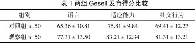 护理结束后,观察组Gesell发育评分明显高于对照组(P<0.05)。见表1。