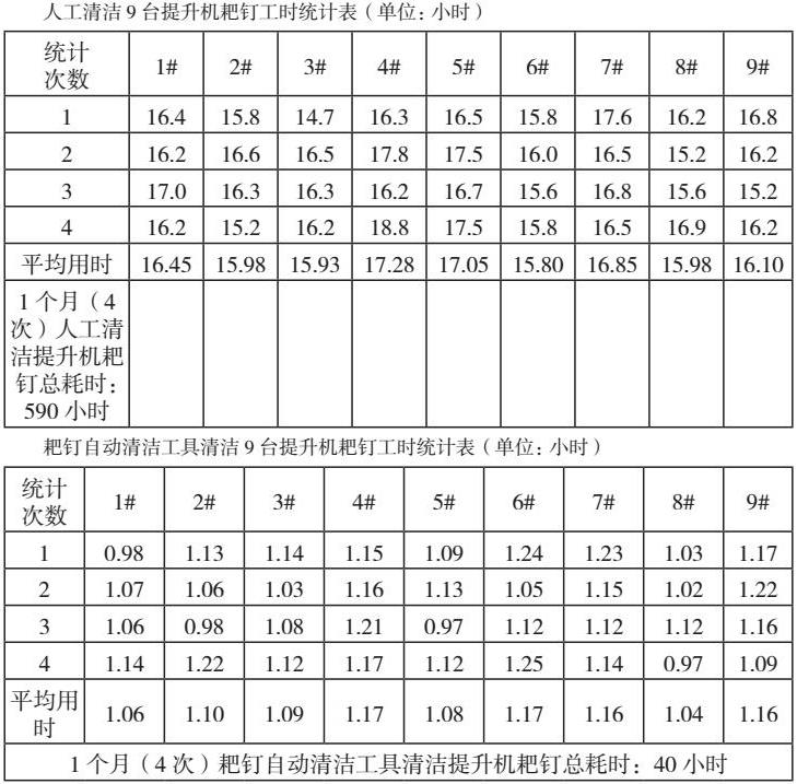 方法:分别统计一个月(4次),某烟厂人工用毛巾、钢丝刷手动清洁9台提升机耙钉使用时间和用耙钉自动清洁工具清洁9台提升机耙钉使用时间。