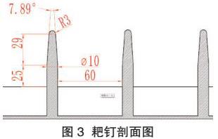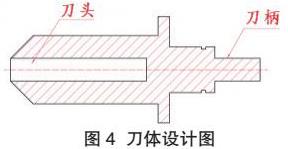 测量耙钉各部分尺寸,如图3所示:耙钉柱面长25mm,直径10mm,锥面长32mm,顶圆半径3mm,锥面角度7.89,耙钉分布间距60mm。根据测量所得的耙钉尺寸,对刀体的结构进行设计,如图4,刀体由刀头和刀柄组成。刀柄是与动力源相连接的部分,根据动力源安装需求作适应性设计。