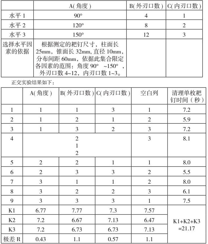 刀头内切削面深度小于耙钉实长,起到定位限位的作用,防止刀体切削时对耙钉造成损伤。刀头需要考虑外刃口数,角度,内刃口数3个因素。选取3个因素水平,通过正交试验,对外刃口数,角度,内刃口数进行确认。切削能力试验因素水平表如下表: