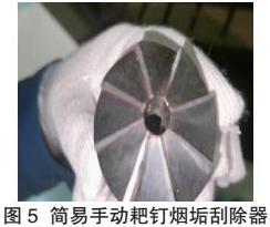 试验一:清理耙钉转速测试。按已设计好的刀头结构制作如图5所示的简易手动耙钉烟垢刮除器。