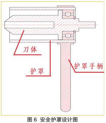 安全护罩结构设计如图6,为保证刀体运转中不与安全护罩干涉,安全护罩与刀体间隙设计为5mm。清洁耙钉后刀体与护罩间会存留污垢,为便于清洁,安全护罩设计为分体式,通过摩擦系数小,油润滑转速高的滑动轴承与刀体连接。为保证护罩在工作中保持稳定,护罩设计了固定手柄,固定手柄与护罩采取螺纹连接的方式。工作中护罩不转动,没有伤害操作人员的可能。