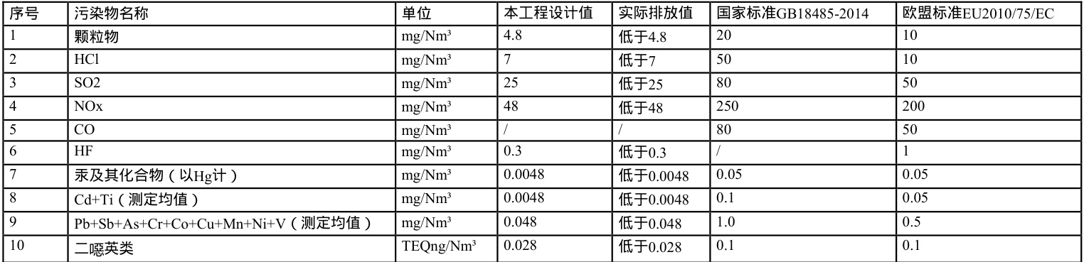 太仓项目投产后,烟气排放指标优于国标及欧盟标准,实现了烟气超低排放。具体排放指标如下表所示: