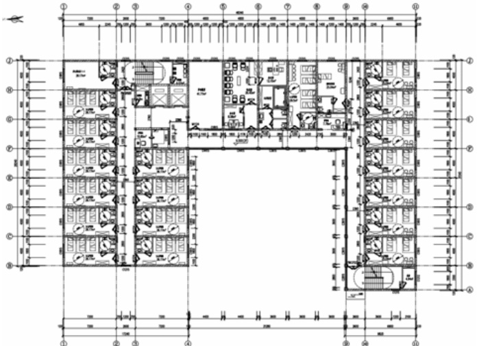 本护理院位于市长宁区,是一栋多层砌体结构房屋;建筑竣工于 2007 年,高度21.15 米,建筑面积 7946.7 平方米;地上 7 层,首层层高为 3.6 米,其上各层层高均为 2.9 米;建筑平面整体呈凹字形,典型建筑平面布置图如图 1 所示。为满足消防报审需求对本建筑进行局部改造,并对改造后的房屋进行整体验算及加固设计,力求在功能改变的同时,确保结构的安全与抗震性能。