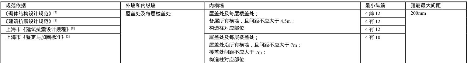 根据检测结果,本建筑圈梁纵筋为4 10,箍筋为 6@200 ,结合上表可以得出,圈梁的设置范围满足各规范要求,纵筋满足市《鉴定与加固标准》的要求,对比其他规范要求纵筋直径稍有不足,箍筋满足各规范要求。