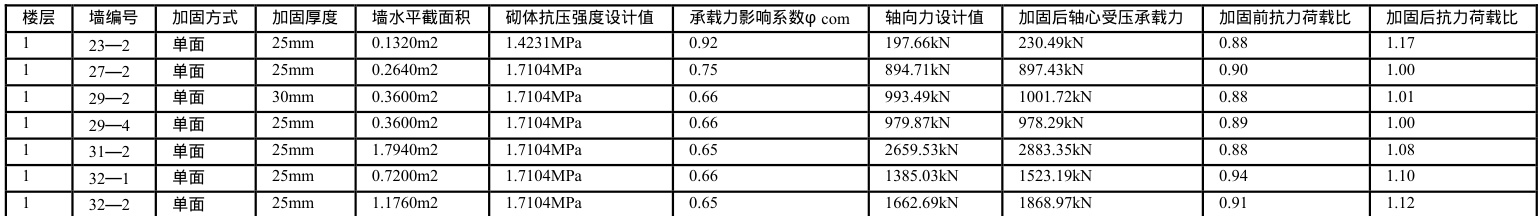 7.2 整体计算中受压承载力验算结果大于 0.85 小于 1.0 的砌体抗震墙,采用高延性纤维增强水泥基复合材料(以下简称 ECC)进行加固。ECC 具有高延性、高强度、良好的裂缝控制能力等特性,其拉伸应变硬化特性使其在承受较大变形时仍能保持良好的力学性能,能有效提高砌体抗震墙的受压承载力和变形能力,适用于本项目中受压承载力略不足的砌体抗震墙加固。此部分砌体抗震墙加固后的受压承载力验算结果最小值为 1.00(表 4)。