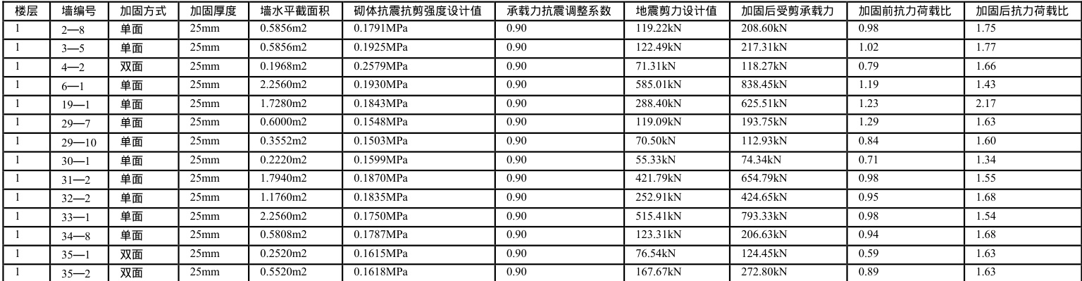 7.3 依据上文,砌体抗震墙抗震承载力验算结果按不小于 1.3 控制。计算结果显示,各层均存在抗 震承载力验算结果小于 1.3 的砌体抗震墙,底层问题最为突出,以上各层逐层减少,这些墙体均需进 行抗震加固。此部分砌体抗震墙采用 ECC 进行加固,加固后的抗震承载力验算结果最小值为 1.30(表 5)。