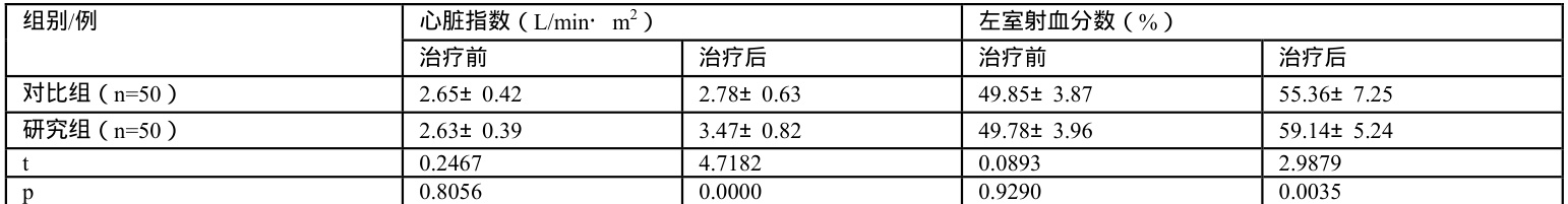 疗程后,研究组、对比组的心脏指数、左心室射血分数比较:研究组> 对比组, p<0.05 。如下表2: