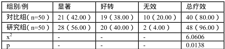 研究组、对比组比较: 96.00%>80.00% , p<0.05 。如下表1: