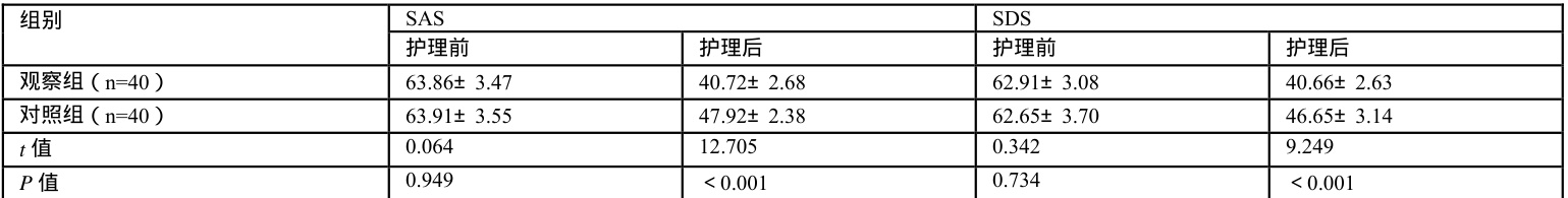 观察组护理后的SAS、SDS 评分低于对照组( P<0.05 )。见表