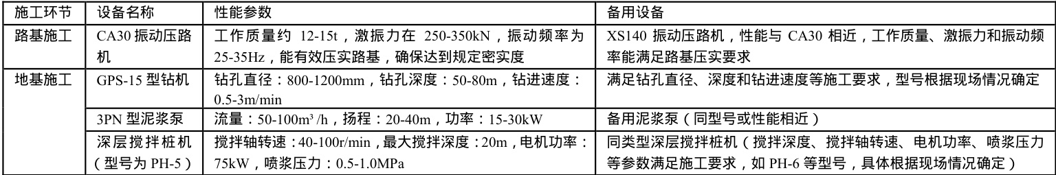施工,不同环节需适配特定性能的设备,而备用设备则是应对突发状况的关键,确保施工的连续性。下面的表格详细列出了道路工程主要施工设备的性能参数及备用设备情况。