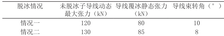 运用 ABAQUS 软件分别建立特高压输电线路的导线模型和耐张串连接金具的整体模型,基于改变密度法模拟均匀覆冰的六分裂导线和覆冰脱落过程,研究不同步脱冰时各子导线的动态张力和导线束扭转角的变化规律。相关结果显示,未脱冰子导线的动态最大张力大于导线覆冰静态张力,导线动张力与导线束的转角大体呈负相关关系,具体数据如下表所示。