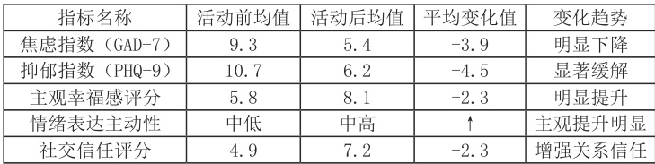 在上述活动实践中,系统化的反馈与评估机制是疗愈效果可视化与可复制的关键。项目团队借助《简版情绪量表》(GAD-7、PHQ-9)及定制化“主观幸福感问卷”,结合访谈记录、行为观察与作品分析等方式,评估活动前后的变化趋势。以下是“心灵涂鸦”项目中部分参与者评估数据汇总表1 :
