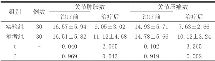 治疗前,实验组的关节肿胀数与关节疼痛数均呈近似水平( (P > 0.05 );治疗后,实验组的关节肿胀数及关节压痛数均明显更少(
