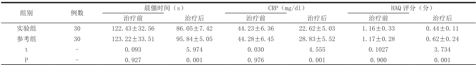 治疗前,实验组的晨僵时间、CRP 水平及 HAQ 评分均呈近似水平(
