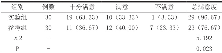 (4)治疗满意度 :通过本院自制的问卷调查患者对治疗效果的满意度,分为非常满意、满意和不满意三个等级。总满意度 =(十分满意 + 满意)/ 总例数 *100%。