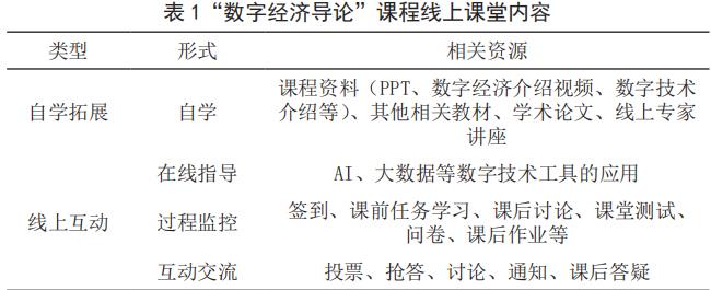 首先,结合 OBE 理念,采用混合教学模式和项目教学法进行教学。在开展线下教学的同时,依托学习通平台增设线上课堂作为课程拓展学习部分,即采用混合式教学模式开展教学。其中,增设的线上课堂可分为“自学拓展”和“线上互动”两部分。在“自学拓展”部分,学生可以自主学习任课教师上传的 PPT 课件、数字经济相关视频、学术论文、行业报告、线上专家讲座、数字经济应用等资料。在“线上互动”部分,教师通过在线指导、过程监控和互动交流等形式持续监测学情。具体内容详见表1 :
