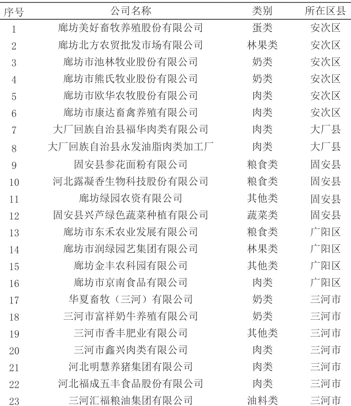 据统计,2024 年,环首都农业科技示范带所在6 个 市区县的国家 产业化龙头企业有4 家(河北福成五丰食品股份有限公司、三河汇福粮油集团有限公司、 河北 达畜禽养殖有限公司和固安县参花面粉有限公司)、省级龙头企业 24 家(具体如表 1 所示),另外还有 5 个村庄安次区新立村、三河市大石各庄村、固安县板材村和香河县庆功台村、太平庄村成为2024 年河北省美丽休闲乡村 [12