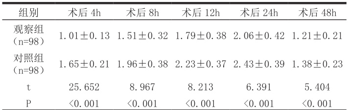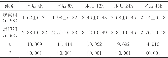 观察组术后4、8、12、24、48h 的静息与运动疼痛评分皆较对照组低,