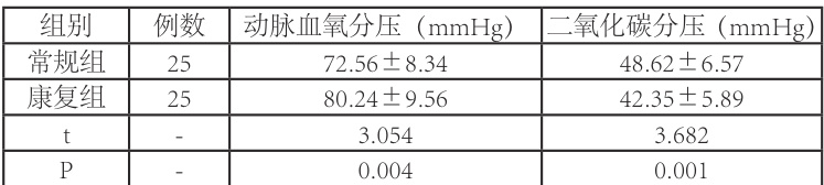 纳入2024 年1 月至2025 年1 月期间,在我院收治的重症肺炎患者,共 50 例,其中以常规护理措施的患者设为常规组;以康复护理措施的患者设为康复组。常规组患者性别比为 14:11;年龄区间( (20~72) ),平均年龄( 45.6±8.3⋅ )岁;康复组患者性别比为13:12;年龄区间( (22~75) ),平均年龄( 46.2±7.9 )岁。两组患者一般资料无显著差异( P>0.05, ),具有可比性。