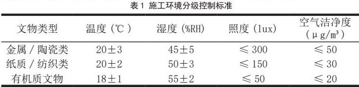 建立分级环境控制标准(表1),根据文物材质分类实施差异化管理。以纸质文物为例,施工区域需维持温度18-22℃、相对湿度50%-55%的恒稳状态,波动幅度不得超过±2℃/±3%。上海市历史博物馆改造工程中,通过装配式空气幕墙系统将施工区与展陈区形成气压梯度差,成功将PM2.5浓度控制在15μg/m³以下,达到《博物馆环境质量标准》一级指标要求。