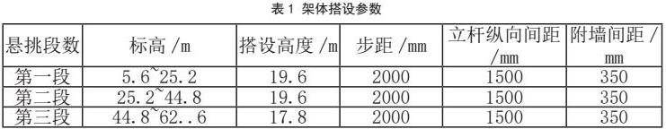 以项目中的20层住宅为例,采用分段搭设花篮悬挑式盘扣脚手架,搭设具体参数如表1所示。