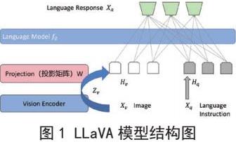 使用LLaVA模型进行图像处理的具体实现过程如下。输入图像,使用预训练好的CLIP视觉编码器ViT-L/14提取图像视觉特征表示为,在实验中引入了一个简单的线性层将最后一个transformer层前后的特征与语言模型中的词嵌入空间,这个线性层使用一个可训练的投影矩阵,将视觉特征转换为语言嵌入标记,确保了与语言模型中的词嵌入具有相同的维度: