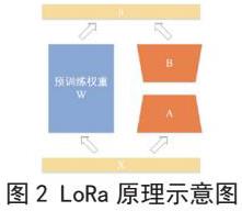预训练LLaVa模型对于细粒度车辆识别能力可以通过对模型进行微调来提升。本文采用LoRa低成本微调方法对LLaVa进行微调。如图2所示,LoRa(Low-Rank Adaptation)基于大模型的内在低秩特性,通过增加旁路降维矩阵和升维矩阵来模拟全参数微调,是当前最有效的大模型微调方法之一。具体训练时,冻结大语言模型的预训练参数,只更新降维矩阵 A和升维矩阵B的参数。模型完成训练后,将预训练参数W和矩阵参数A和B进行叠加。矩阵参数A和B的参数量远远小于预训练参数W。因此,LoRa能够有效减少训练参数的数量,从而降低大模型训练对于硬件的需求。所以,本项目拟采用LoRa方法来训练多模态大模型实现遥感影像和文本(开放词汇)的语义对齐。
