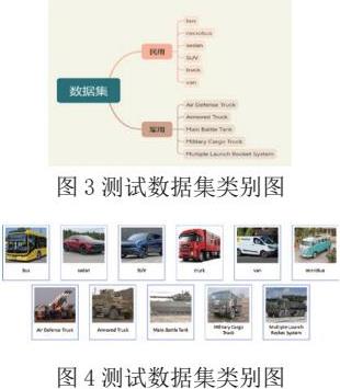 为了验证所提出方法的有效性,本文构建了包含3300张图像的实验数据集。根据车辆用途划分为民用和军用两大类,具体分类结构如图3所示。其中民用类别包含六种子类别,军用类别包含五种子类别,每种子类别包含300张示例图像,每个车辆类别的示例如图4所示。