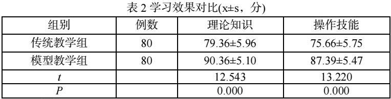 学习效果对比,模型教学组高于传统教学组(P<0.05),见表2:
