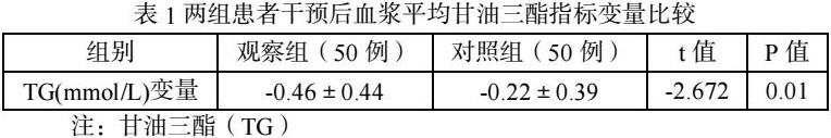 2个月随访结束后结果显示:观察组患者平均甘油三酯2.126mmol/L,平均降低0.46mmol/L;对照组患者平均甘油三酯2.392mmol/L,平均降低0.22mmol/L。我们发现,观察组干预后患者平均甘油三酯降幅水平明显高于对照组,其差异有统计学意义(P<0.05)。见表1。