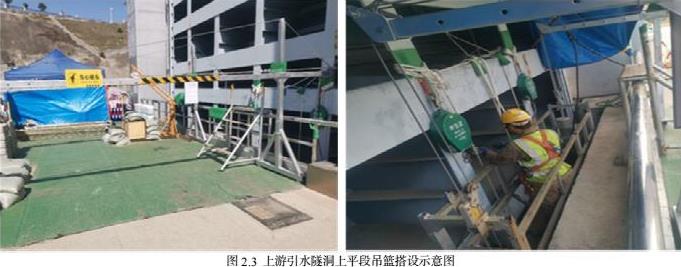 拟在上游引水隧洞工作闸门位置搭设电动吊篮作为施工人员进出上平段流道的通道。工作闸门与井壁间距62cm,地面距输水流道底板高度41.2m,因工作闸门与井壁间距受限,需要定制电动吊篮,吊篮工作平台规格:宽度50cm、长度3m。