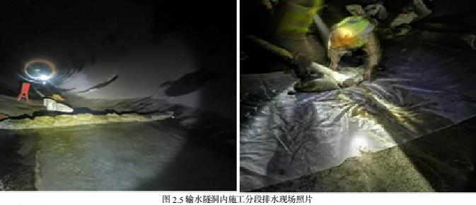 输水引水-尾水隧洞衬砌混凝土渗水和预留排水孔渗水,而且渗水点多面广,比较分散,所以本次施工排水采用了从上游到下游分段引排方式,每段按150m 左右控制。在处理区域上游侧搭设挡水围堰,围堰采用沙袋+塑料布方式,然后铺设φ160mmPVC 管作为排水管,将隧洞内渗水引排至处理区域下游侧。