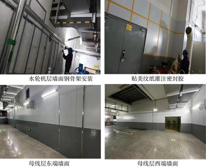 湖北白莲河抽水蓄能电站地下厂房位于白莲河水库大坝右坝头上游侧山体内,垂直埋深约200m,主厂房洞室纵轴线方向为东西向,主厂房开挖尺寸为146.40m×21.85m×50.883m,安装4台单机容量为300MW的可逆式水轮发电机组,总装机容量1200MW,主机间共分5层,从上至下依次为电动发电机层、母线层、水泵水轮机层、锥管层和尾水管层。厂房母线层、水泵水轮机层墙面装饰层为乳胶漆墙面,容易出现破损、污垢、开裂情况,受限于施工工艺和材料质量等因素,需频繁进行维护,成本较高,效果不佳。