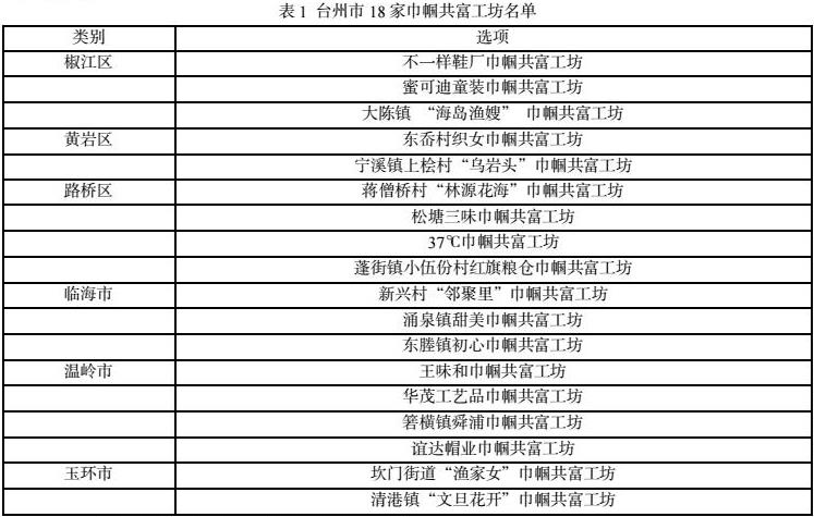 台州市为我国民营经济发达的地区之一,在推动农村创业和女性发展方面一直走在前列。近年来,台州市积极响应国家乡村振兴战略,大力推进“巾帼共富工坊”的建设,旨在为农村女性提供创业就业的平台,促进女性增收致富,助力乡村振兴[3]。截至目前,台州市建立的“巾帼共富工坊”涵盖了手工编织、农产品加工、乡村旅游等多个领域,吸引了众多农村女性参与其中。这些工坊不仅为农村女性提供了稳定的收入来源,还通过技能培训、创业指导等方式,提升了她们的创业能力和综合素质,成为农村女性创业的重要载体。
