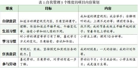 在“自我管理”项目内容探究中,主要把“自我管理”内容细化为五个维度,即自律意识、生活习惯、学习习惯、任务意识、参与劳动,并把每一个维度的目标和内容也进行细化,如下表1: