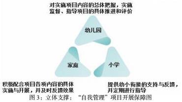 幼小衔接的顺利开展,单单靠幼儿园一个主体是远远不够的,所以为确保项目能够有效开展和推进,我们围绕幼儿园、家庭、小学三角立体支撑,架构了幼儿园层、家长层、小学层逐层推进式的操作策略,如图3: