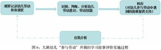 学习故事是教师在项目活动中观察和记录幼儿活动中发生的学习故事,其中除了有故事记录,也有教师对幼儿活动的识别、判断、分析和回应设计,在项目开展中是一种从儿童视角评价项目实施,例如图12围绕大班幼儿“参与劳动”开展的学习故事评价。