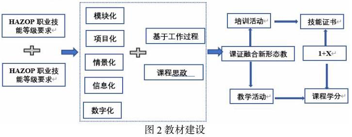 教材是“1+X”证书制度试点过程中教学改革的重要载体和体现形式。化工危险与可操作性(HAZOP)职业技能等级证书考核内容主要包括包含作业准备、HAZOP分析、HAZOP分析文档跟踪三大阶段内容,具体分为作业准备、HAZOP分析节点划分、偏离确定、后果识别、原因分析、安全措施、风险评估、提出建议措施、报告编制等内容,而该部分的考核内容主要体现在化工生产技术和化工安全与环保两门课程上,因此以化工危险与可操作性(HAZOP)职业技能等级证书为抓手,将 X 证书技能培训内容融入化工生产技术、化工安全与环保等课程中,以化工相关企业工作过程为导向,开展模块化、项目化、情境化、信息化、数字化课程建设,开发课证融合教材【5】。课程开发过程中,邀请化工企业参与新教材编写,新教材紧密结合化工产业发展方向和技术更新,将化工行业新技术、新工艺、新规范纳入教材。通过职教云、MOOC等学习平台,充分利用信息化技术,建设线上开放课程资源,形成线上线下资源融合的“立体化”教材,以实现满足不同类型学生个性化的学习需求,促进学生自主学习能力和创新思维的发展【6】。教材建设如图2所示。