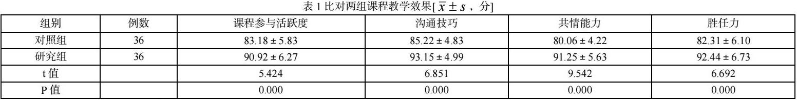 研究组学生课程参与活跃度、沟通技巧、共情能力、胜任力评分均高于对照组(P<0.05),见表1。