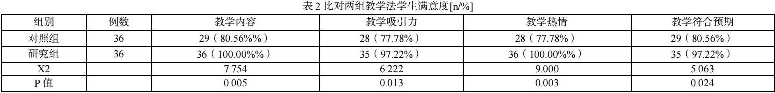 研究组学生对教学内容、教学吸引力、教学热情、教学符合预期满意度均高于对照组(P<0.05),见表2。