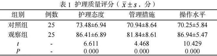 摘要:目的 分析循证护理在经皮股动脉穿刺脑血管DSA术患者围手术期中的应用。方法 选取经皮股动脉穿刺脑血管DSA术患者50例,随机均分为对照组和观察组,对照组实施常规护理,观察组实施循证护理,对比护理质量评分。结果 观察组护理质量评分高于对照组(P<0.05)。结论 经皮股动脉穿刺脑血管DSA术进行循证护理,可以提高护理质量评分。