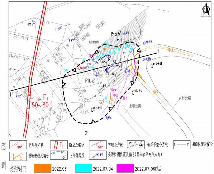 2022年6月29日~2022年7月12日,累计位移量(测点P1~P3)X方向17mm、466.6mm、461.8mm,方向正南;Y方向1.1mm、756.3mm、731.9mm,方向正西;H方向1.1mm、515.6mm、585.9mm,方向竖直向下。