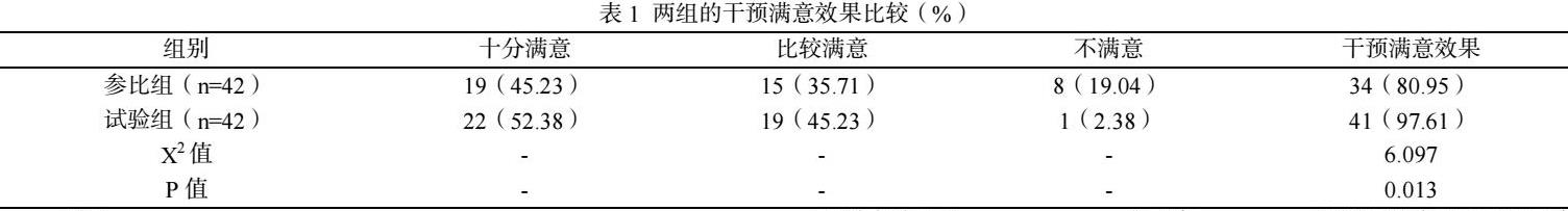 试验组患儿的干预满意效果明显高于参比组,有统计意义(P<0.05),如表1。