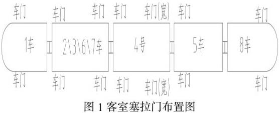 高速动车组为8编组车辆,塞拉门设置在每辆车的四角,1、5、8车设置2套车门,其余车辆均设置4套车门,一列车共26套车门。其中4号车近二位端2套车门采用宽门(净开度900mm),其余24套门采用窄门(净开度800mm)。