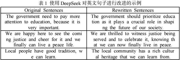 智能语言模型具有高度的智能性与理解力,可以对阅读文章进行语言理解和生成,帮助学生理解文章的语义和结构,提高阅读速度和理解能力,同时提升学生对语言的内化与输出能力。下面便是不同的使用场景的教学几例应用实践。例如,将译林版高中英语必修第三册Unit 3的短文“The first email was sent in 1971 … the ‘Face with Tears of Joy’ emoji, as the World of the Year 2015”输入智能语言模型中(本文的研究均基于DeepSeek),并给予适当的提示语“理解此文,使用英语大意进行总结”,会获得模型输出内容——“This passage briefly describes the origins of three important technologies in communication: email, webcam, and emojis.”再给之提示语“其中适合高中生学习的单词与文化知识”,语言模型会给出“适合学习的单词:webcam, emoji, electronic; 原因:这些单词和概念涉及到了计算机科学、数字技术、网络文化交流等方面的内容,对于高中生学习和了解这些内容都非常有益。”再如,在写作方面,假如学生写出“The city have many people, cars very many, so road busy”这样不连贯或者错误的碎片句子,输入给语言模型,给予提示语“请给出修改建议”,会得到回复“这个句子的意思清晰,但它的表达方式并不正确、严谨。修改建议:This city is heavily populated and the traffic is congested. ”可见,改进后的句子不仅纠正了语法错误,其表达也更加流畅和自然,优美地道。师生通过类似的方式,可以改进学习者的语言输出,提高其表达的精准度和流畅性,大大提升学生的写作能力。以下表1展示了多个使用DeepSeek生成的样例。