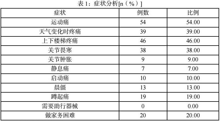 如表1所示,骨关节炎以运动痛、天气变化时疼痛、关节畏寒等为主要症状,其余常见症状包括晨僵、关节肿胀等。