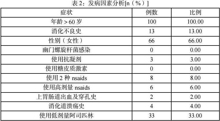 如表2数据所示,100例患者年龄均在60岁以上,有消化不良史的患者较多,女性患者占比较高,提示此病可能和性别、年龄等因素有关。