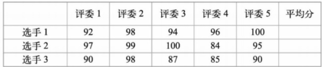 预设学生计算3 位选手的平均分: