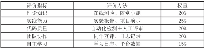 对学生整个学习过程的成果进行综合考量,并通过量化分析检验课程目标的实现情况。将期末考核分为闭卷考试、项目终版提交与结项答辩三部分,分别对应“理论知识深度”“实践综合能力”“创新与表达能力”三大目标。权重分配示例如下:闭卷考试30%、项目提交40%、答辩与展示30%。
